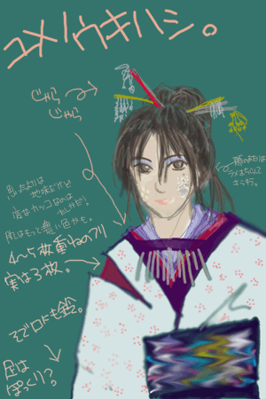 朱塗りの一本、金と銀のが二本ずつ、全部鈴つき。一番上の服の胸元を合わせているのもやっぱり鳴り物つき。思ったより大人しく仕上がったのは無計画にガシガシ描いてるからです。